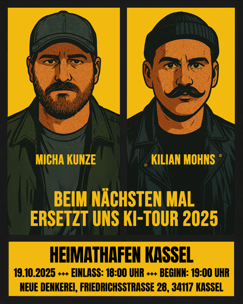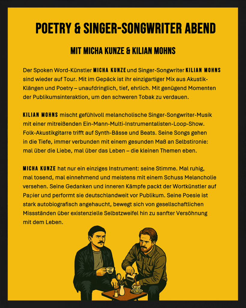 Der Spoken Word-Künstler MICHA KUNZE und Singer-Songwriter KILIAN MOHNS sind wieder auf Tour. Mit im Gepäck ist ihr einzigartiger Mix aus Akustik-Klängen und Poetry – unaufdringlich, tief, ehrlich. Mit genügend Momenten der Publikumsinteraktion, um den schweren Tobak zu verdauen.