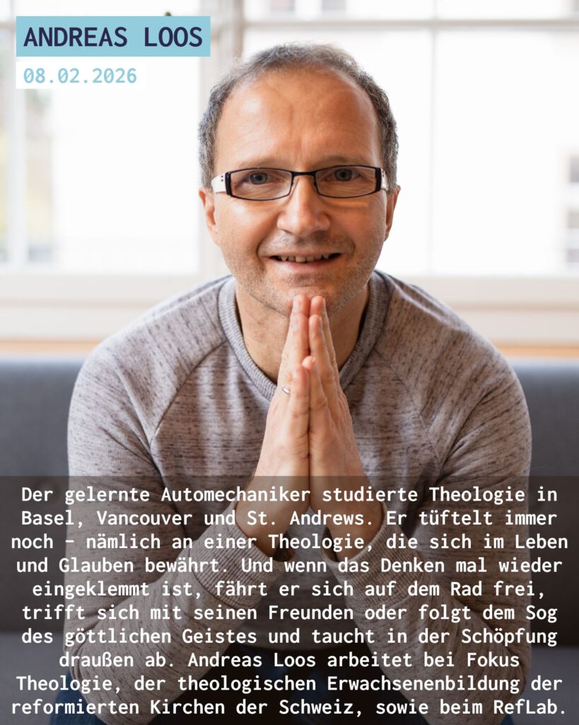 Der gelernte Automechaniker studierte Theologie in Basel, Vancouver und St. Andrews. Er tüftelt immer noch – nämlich an einer Theologie, die sich im Leben und Glauben bewährt. Und wenn das Denken mal wieder eingeklemmt ist, fährt er sich auf dem Rad frei, trifft sich mit seinen Freunden oder folgt dem Sog des göttlichen Geistes und taucht in der Schöpfung draußen ab. Andreas Loos arbeitet bei Fokus Theologie, der theologischen Erwachsenenbildung der reformierten Kirchen der Schweiz, sowie beim RefLab.
