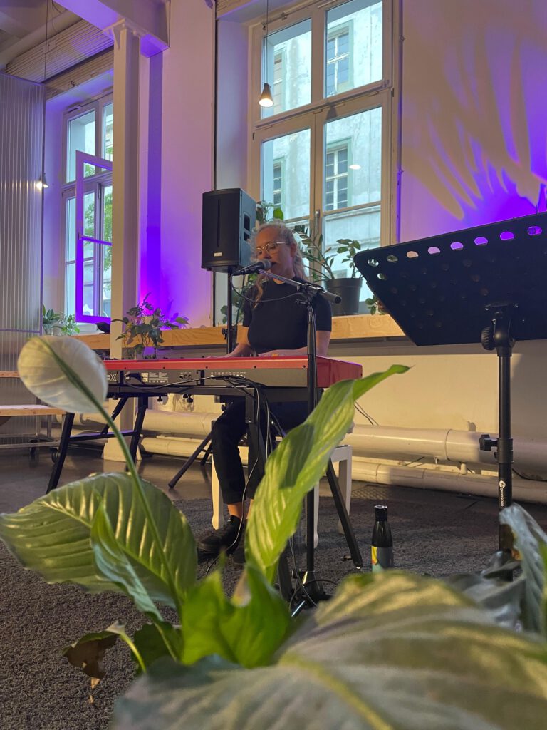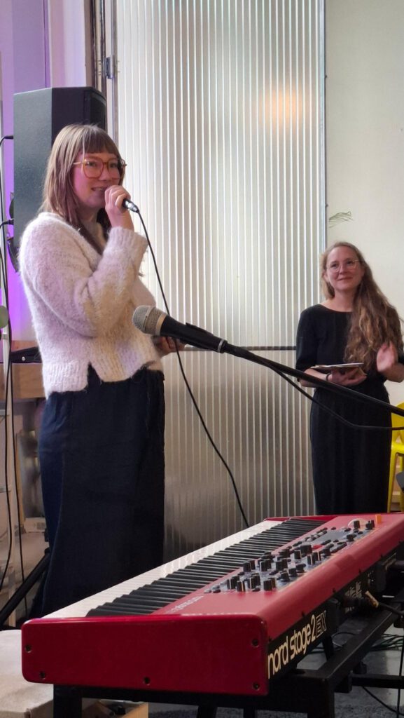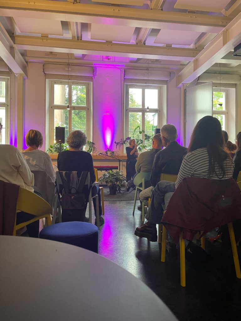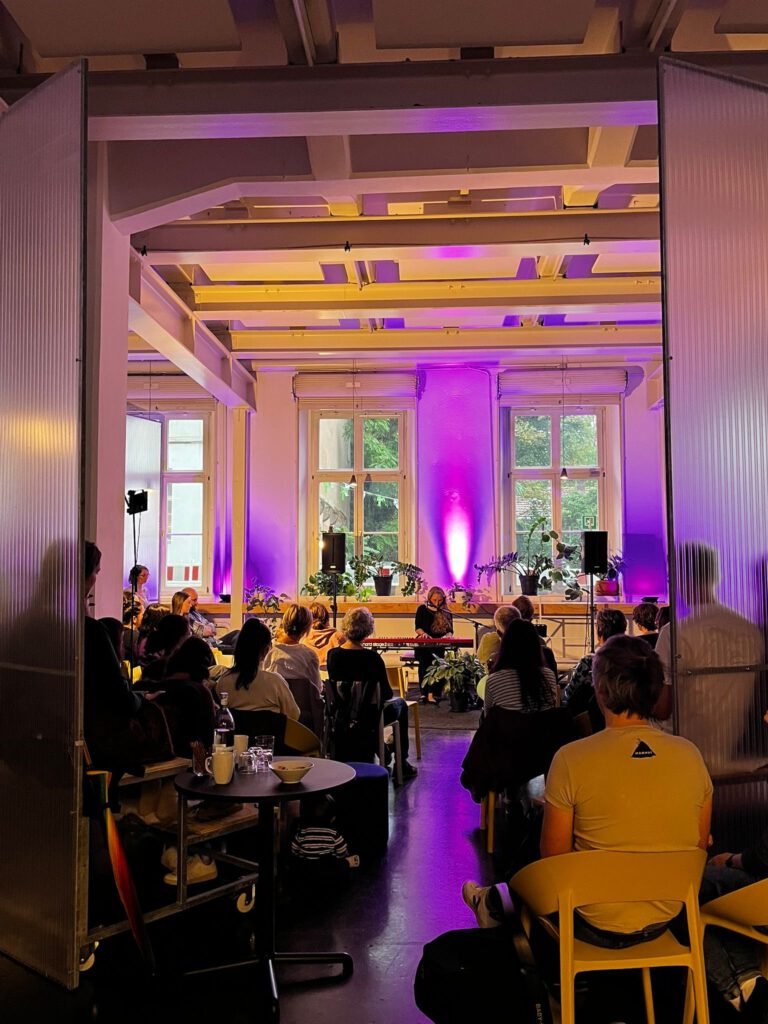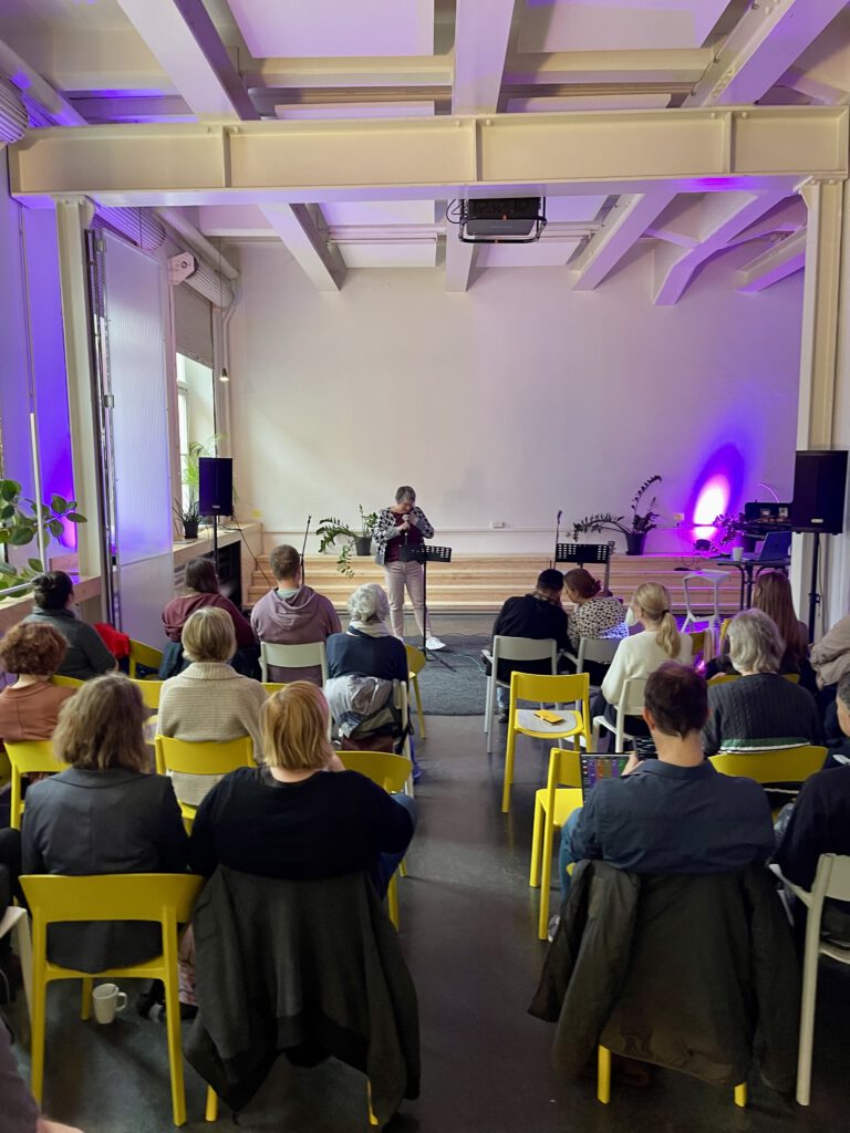Und dann „Lila Katze“ – ein Text, der sich langsam, fast unmerklich, in unsere Herzen schlich. Eine Metapher für Schwere, für das, was uns lähmt – und für die Hoffnung, die bleibt, wenn man das Dunkel beim Namen nennt. Während Micha sprach, legte Kilian darunter feinfühlige Klangflächen, die Worte trugen, statt sie zu übertönen. Poesie und Musik eben.