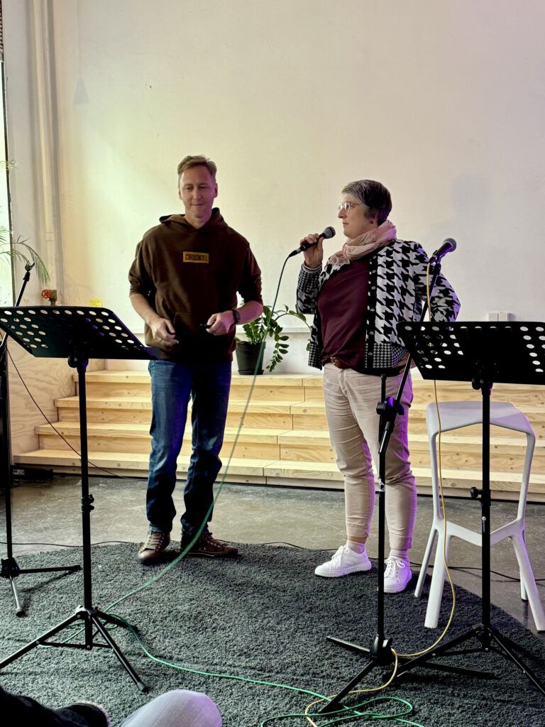 24.12.2023 – Wow, wir sind so dankbar für den Gottesdienst an Heiligabend. Wir waren zu Gast im richtig coolen Studio Angersbach, in das sich knapp 70 Personen eingefunden hatten. Wir hoffen, uns ist der Mix aus unserer gewohnten lockeren Bistroatmosphäre und dem feierlichen Anlass zu Heiligabend gelungen: Punsch und Kekse, unverkrampfte Moderation, zwei verzaubernde Instrumentalstücke mit Cello und Klavier, lockeres Weihnachtsliedersingen und eine etwas andere Weihnachtsgeschichte von Wolle (dem verlorenen und wiedergefundenen Schaf).