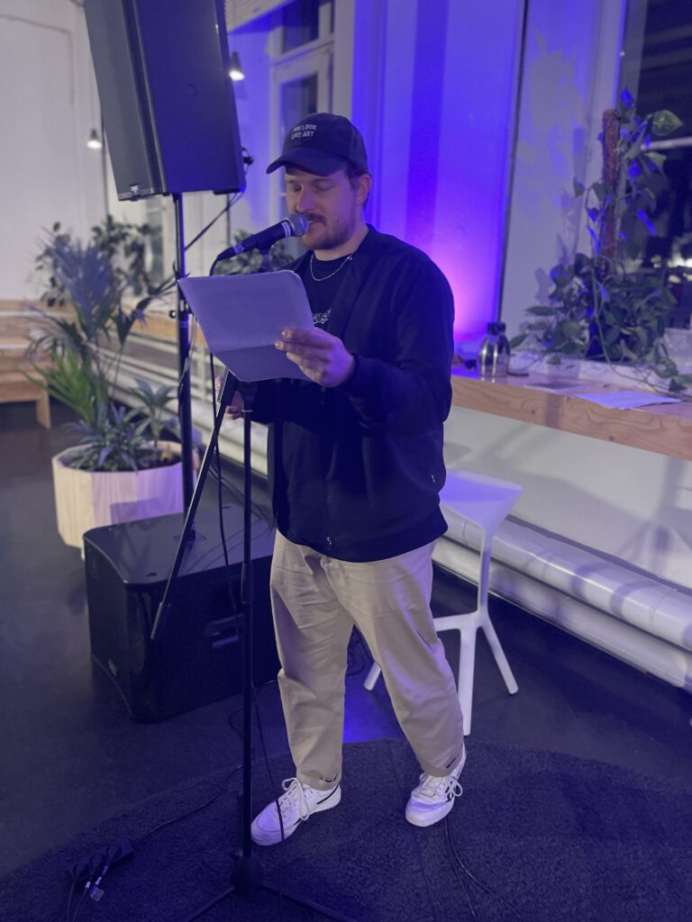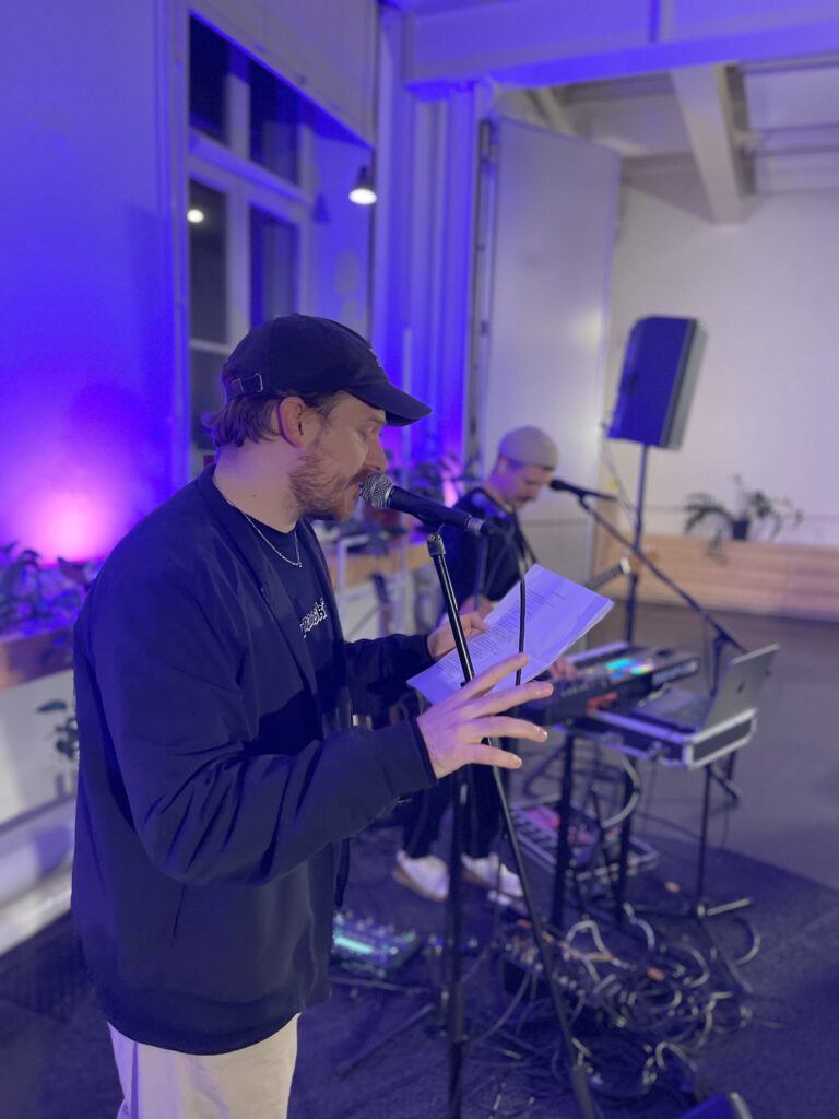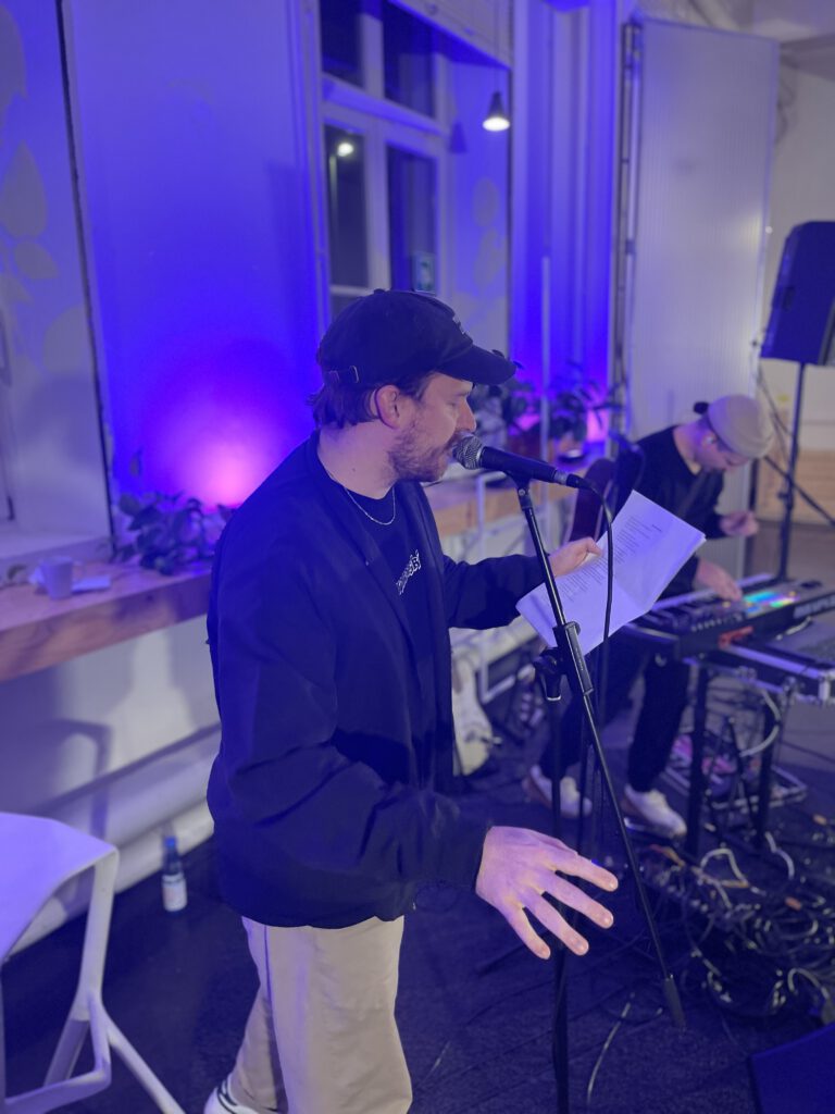 Daneben stand Micha Kunze, der mit nichts als seiner Stimme Räume öffnete. Seine Texte – stark autobiografisch, mal ruhig, mal tosend, immer echt – sind Poesie, die unter die Oberfläche gehen. Zeilen wie „Wir sitzen bis 5 Uhr am Küchentisch und rauchen die Last der Welt. In dir ist grad alles so dunkel, und draußen wird’s grad wieder hell.“ ließen uns still werden.