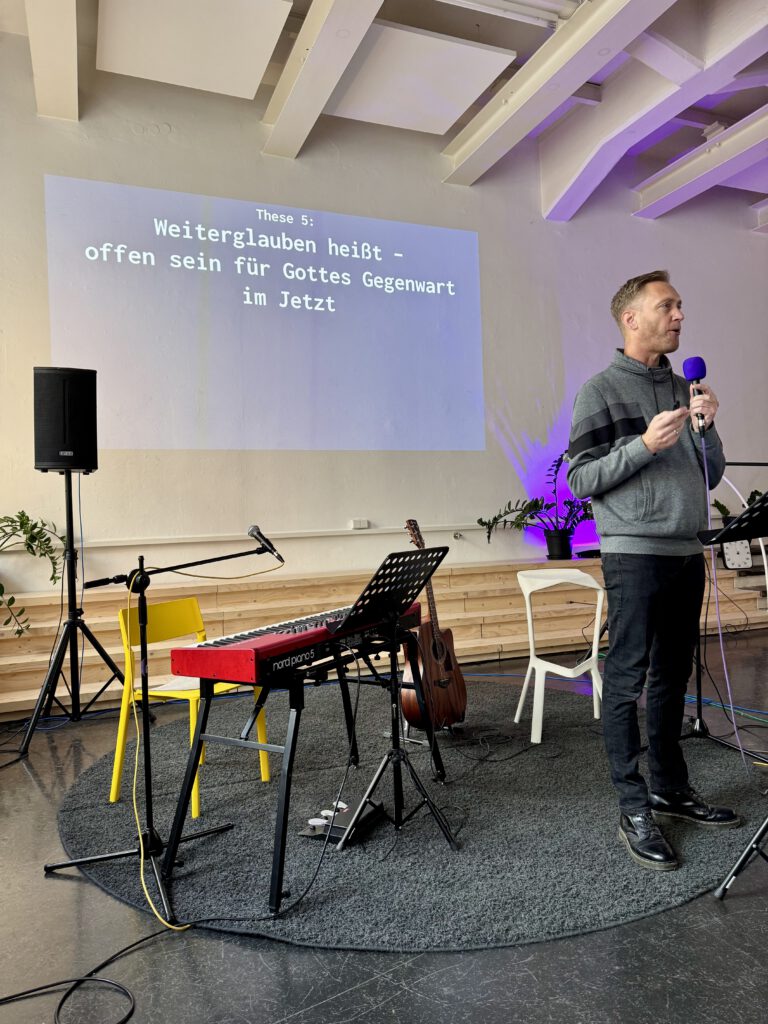 01.06.2025 – Verbunden statt einsam – Wie kommt es, dass ich mich nach Verbundenheit sehne und es dennoch nicht schaffe, diese mit anderen Menschen herzustellen? Und weshalb sind Verbundenheit und Freiheit kein Widerspruch? Der Paartherapeut Rudolf Sanders teilte heute dazu wertvolle Impulse mit uns: Wie entstehen eigentlich Bindungsmuster? Und wie kann ich es trotz früherer Lernerfahrungen schaffen, mich mit anderen verbunden zu fühlen und mich in dieser Verbundenheit zu dem Menschen zu entwickeln, den Gott in mir angelegt hat? Dazu stellte er uns das Konzept der „Partnerschule“ vor, das er gemeinsam mit Fachkolleg*innen seit mehreren Jahrzehnten weiterentwickelt. Durch eine körpertherapeutische Übung und eine Imaginationsübung konnten wir dann ganz praktisch mit unserem eigenen inneren Raum in Kontakt kommen. In den gemeinsamen Liedern haben wir zudem unsere Verbundenheit mit Gott unserem Schöpfer, zum Ausdruck gebracht. Ein Gottesdienst voller hilfreicher Impulse für ein gelingendes Miteinander!