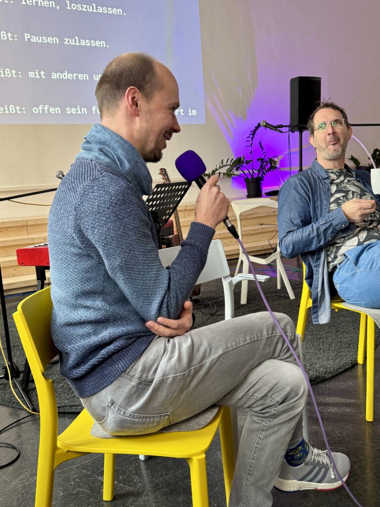 Zu jedem dieser Punkte gab es eine Station, an der wir die Techniken praktisch ausprobieren konnten. Im Anschluss tauschten wir uns offen über unsere Erfahrungen aus – nicht nur über die Übungen, sondern auch über unser Leben, das nicht immer geradlinig oder erfolgreich verläuft und uns manchmal knallhart ausbremst. Dieser ehrliche und bewegende Austausch war ein besonderer Moment des Gottesdienstes, für den wir sehr dankbar sind.