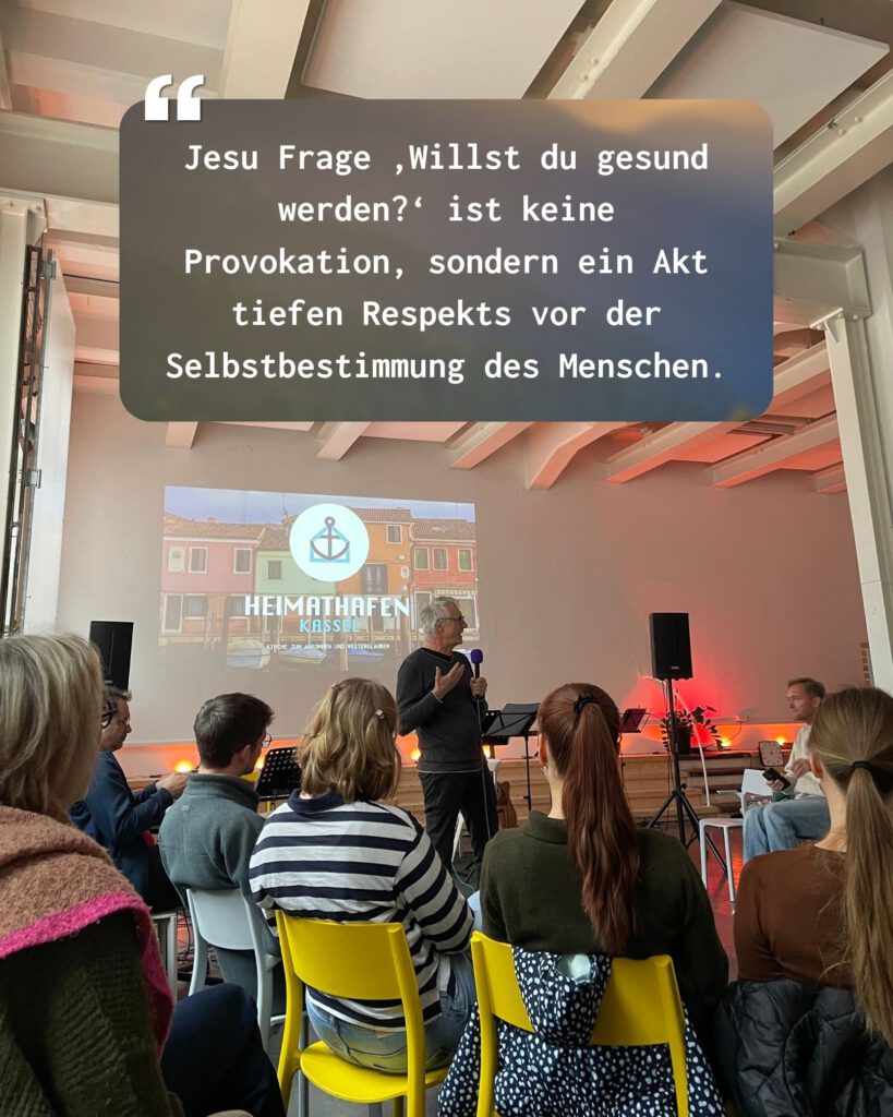 Zentral ist Jesu Frage an den Kranken: „Willst du gesund werden?“ – eine überraschende und zugleich respektvolle Frage, die die Selbstbestimmung des Menschen ernst nimmt. Sie kann als Einladung verstanden werden, aber auch als sanfte Konfrontation: Habe ich mich vielleicht in meiner Situation eingerichtet? Halte ich an Hoffnungen fest, die mich eigentlich lähmen?
