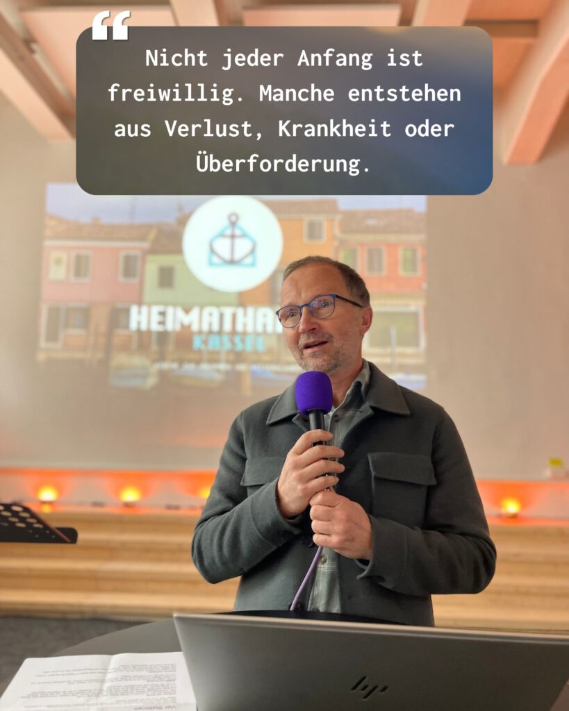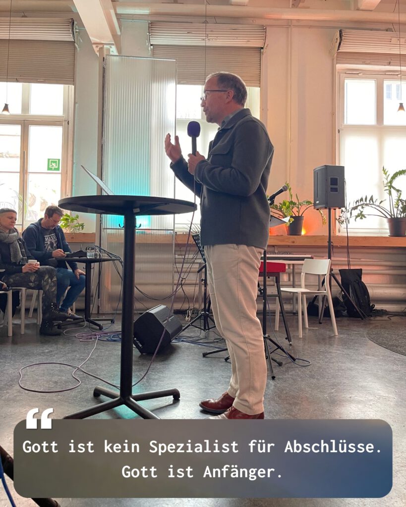 Dem stellt Andreas Loos eine zentrale theologische Perspektive entgegen: Gott selbst ist Anfänger. Der Geist Gottes ist von Anfang an da – in der Schöpfung, in Maria, in Jesus Christus. Gott beginnt nicht nur Neues, sondern lebt den Anfang selbst. In Jesus wird Gott lernend, verletzlich, menschlich. Gott trägt ein „L“ auf dem Rücken – Learner, Beginner.
